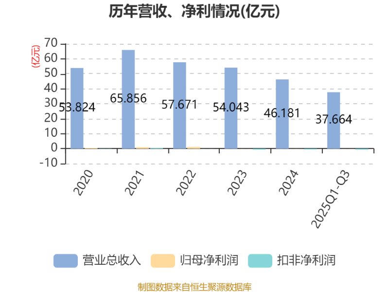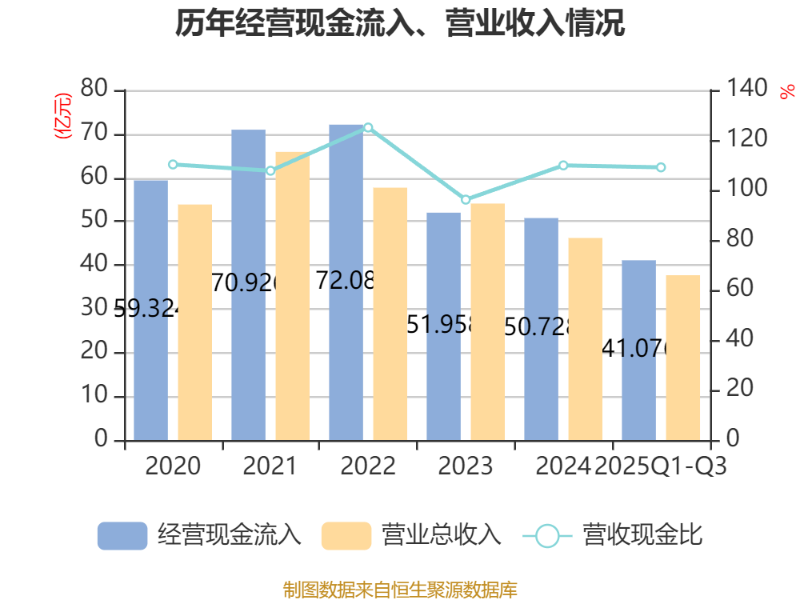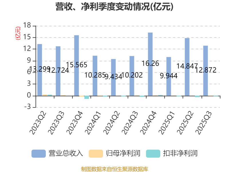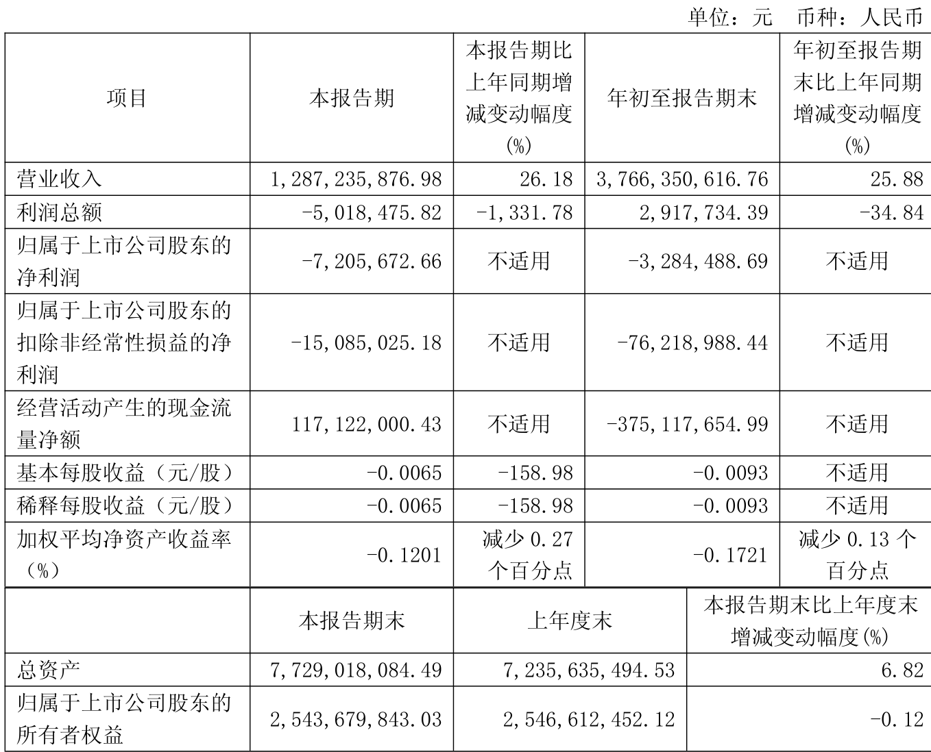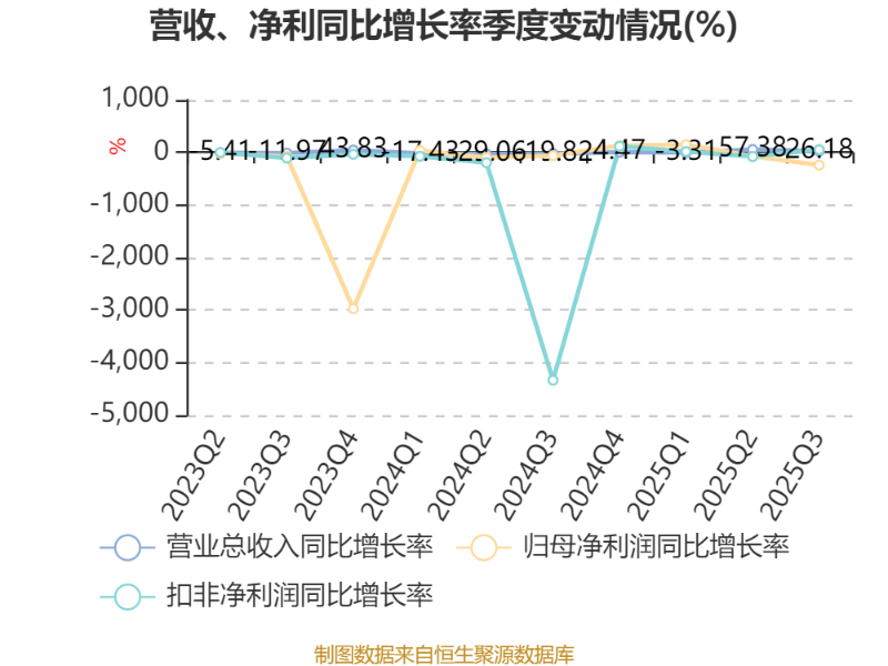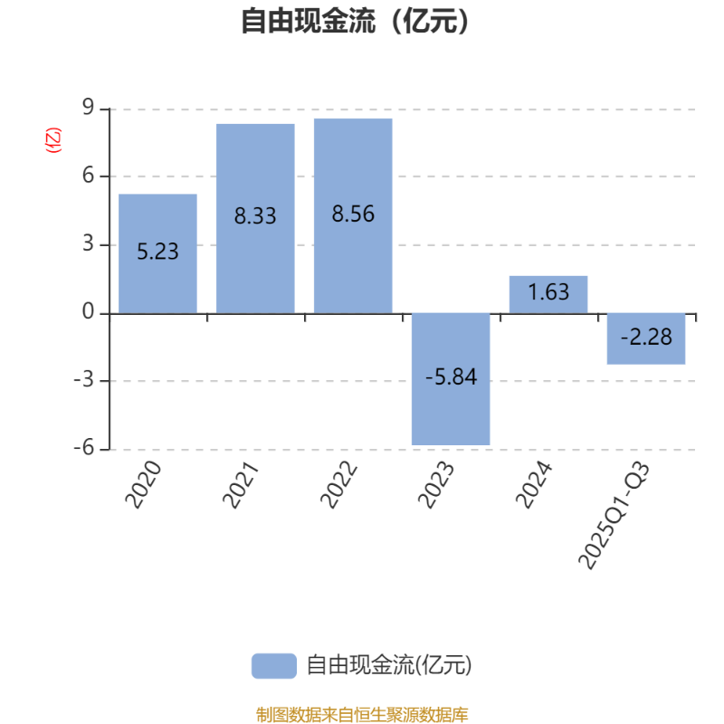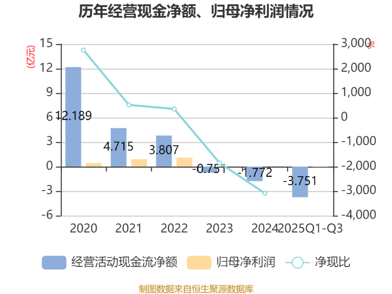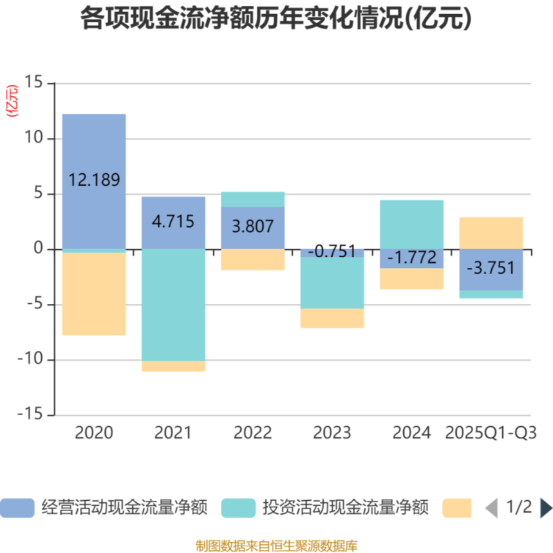 2025年前三季度,公司经营活动现金流净额为-3.75亿元,同比增加8346.04万元;筹资活动现金流净额2.86亿元,同比增加2.32亿元;投资活动现金流净额-7261.15万元,上年同期为3.32亿元。